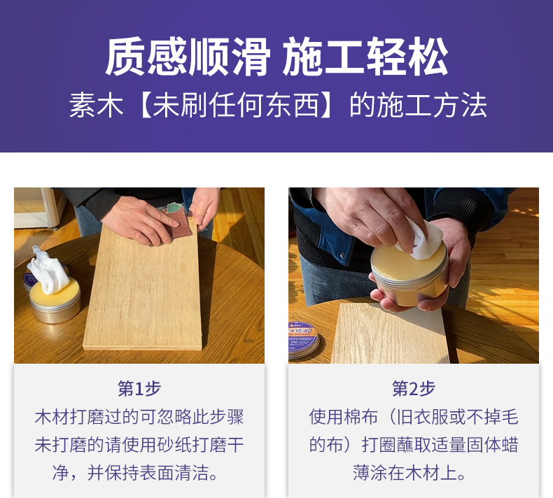 第二種:將家具表面用濕毛巾擦干凈,然后通風(fēng)晾干兩小時(shí);通風(fēng)干燥后可直接使用美林涂料固體保養(yǎng)蠟擦涂。將家具處理完成后,將固體蠟打開(kāi),然后用干凈的棉布或海綿沾取固體蠟;在家具或地板表面“轉(zhuǎn)圈”式打蠟即可,施工一遍不要做的太厚。打蠟完成后等待3小時(shí)左右即可。
